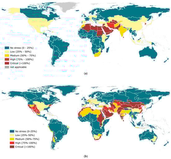 Globally, 18.6% of the available total renewable freshwater resources were being withdrawn in 2021, showing a general “no stress” condition of the globe. Nonetheless, this global value hides the higher values and the variability that exists at a finer scale [9]. The map of the indicator at the country level is in Figure 1a. Aggregating water stress values at global and regional levels masks significant disparities, stressing the need for disaggregation to better understand causes and impacts [10,11]. Such disaggregation facilitates policy- and decision-makers to target interventions more effectively, focusing on regions with high water stress and sectors with significant water use.