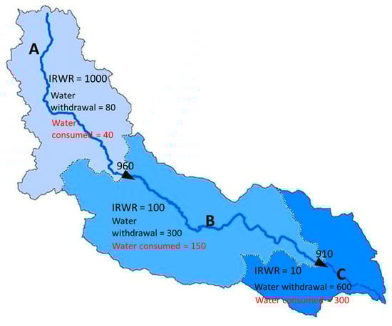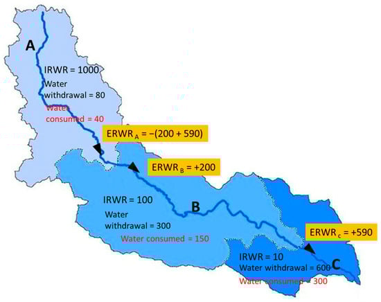 Figure 3. Example of a river basin including 3 SBs: SB A (head of the basin), SB B and C (downstream), showing the water exchanged between SBs (ERWR), considering the hypothetical water consumed in each SB. Source: authors’ own elaboration.