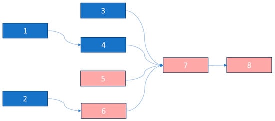Figure 5. Schematic view of a river basin with 8 sub-basins. SB 1 and 2 (head of the basin), SB 7 and 8 (downstream sub-basins). In red are the sub-basins where there is a water deficit, and in blue are those where there is a hypothetical water surplus.