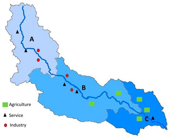Figure 6. Example of a basin including three sub-basins (A, B, C) showing the water supply side approach. Withdrawal points by sector are represented by different symbols. Source: authors’ own elaboration.