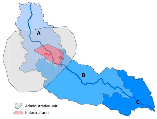 Figure 7. Example of a basin including three sub-basins (A, B, C) showing the hydrologic factor, used to disaggregate a water demand available at the administrative level, in a water demand by hydrologic unit. The red polygon represents the polygon of an industrial area in a land use/land cover map. Source: authors’ own elaboration.