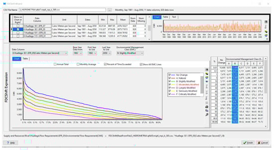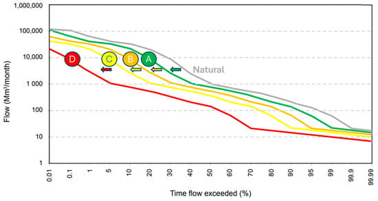 Figure 8. Flow duration curve. Classes A and B represent the unmodified and largely natural conditions, where no or limited modification has occurred or should be allowed. Class C is defined as moderately modified, with limited impact on ecosystem integrity. Largely modified ecosystems (Class D) show considerable, albeit still acceptable, modification from the natural state [29].
