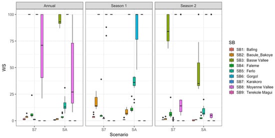 Figure 14. Boxplot of aggregate values of water stress in the Senegal River basin by sub-basin and season for two development scenarios (trend situation SA and optimised situation S7). Source: authors’ elaboration.