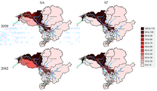 Figure 15. Water stress in the Senegal basin in a high rainfall year (2039) and a low rainfall year (2042), created by the WEAP SRB model.