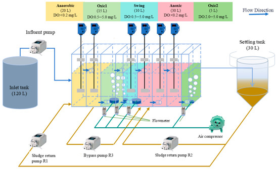 A continuous-flow plug-flow reactor was utilized in this study (Figure 1). The system consisted of an influent tank (120 L), a continuous-flow ASAO reactor (80 L), and a secondary clarifier (30 L). The simulated wastewater, along with a portion of the return sludge from the secondary clarifier, initially entered the anaerobic zone of the ASAO reactor. Subsequently, a fraction of the mixed liquor from the anaerobic zone flowed into the aerobic zone of the ASAO reactor, and then proceeded to the swing zone. Next, the remaining mixed liquor from the anaerobic zone, all the mixed liquor from the aerobic zone, and another portion of the return sludge from the secondary clarifier were directed to the anoxic zone. Finally, the mixed liquor was transported to the secondary clarifier for sludge–water separation. The overall HRT of the system was 16 h. The zone-specific HRT ratios were as follows: Anaerobic:Swing Aerobic (Oxic1 + Swing):Anoxic:Oxic = 2:2.5:3:0.5, corresponding to respective HRTs of 4 h (Anaerobic), 5 h (Swing Aerobic, including 3 h for Oxic1 and 2 h for Swing), 6 h (Anoxic), and 1 h (Oxic). Among these, R1 represented the first sludge return ratio, with 100% of the return sludge directed to the beginning of the anaerobic zone; R2 denoted the second sludge return ratio, with 100% of the return sludge directed to the beginning of the anoxic zone; and R3 indicated the bypass pump, where 30% of the mixed liquor at the end of the anaerobic zone was directly conveyed to the beginning of the anoxic zone. The detailed operating conditions for this stage are summarized in Table 1.