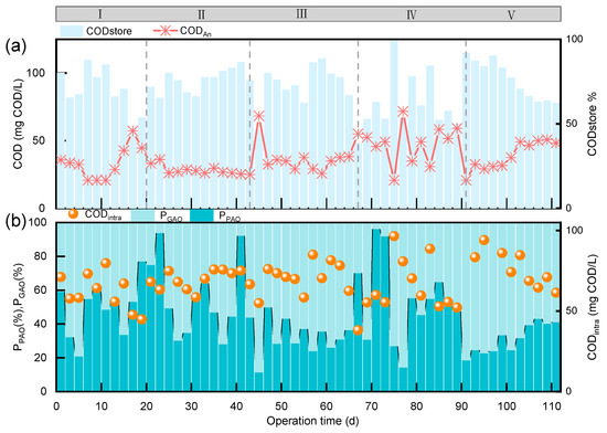 The carbon source storage situation within the ASAO system. (a) The storage volume of internal carbon sources; (b) the storage ratios of PAOs and GAOs.