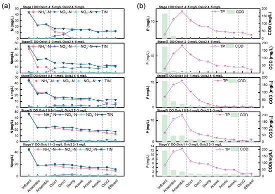 Typical periodic nitrogen and phosphorus removal effects. (a) The overall removal efficacy of nitrogen at each stage; (b) the overall removal efficacy of COD and phosphorus at each stage.