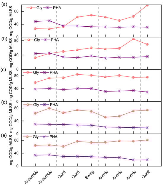 The analysis of routine indicators in this study was performed in accordance with the national standard detection methods (Table 3). Water quality parameters were monitored every two days, with measurements taken for NH4+-N, NO3−-N, NO2−-N, COD, and TP in the influent and effluent, and at the end of the anaerobic, pre-aerobic, and anoxic zones. At the end of each cycle, the water quality in each compartment of the reactor was analyzed. Samples were collected and subsequently filtered through a 0.45 μm acetate cellulose membrane for further analysis. Sludge samples from each reaction zone were also collected to quantify the intracellular carbon content. The samples were first freeze-dried, and polyhydroxyalkanoates (PHAs), represented as the sum of poly-3-hydroxybutyrate (PHB) and poly-3-hydroxyvalerate (PHV), were determined using gas chromatography [6]. Gly was analyzed by the anthrone method [7].
