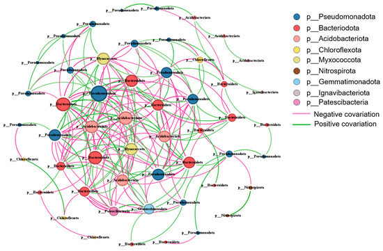 As depicted in Figure 7, the microbial symbiotic network diagram reveals that the majority of the nodes originate from the aforementioned seven phyla, including Pseudomonadota (42.98%), Bacteroidota (23.14%), Acidobacteriota (9.09%), and others. It can be observed that most genera within the same phylum predominantly exhibit symbiotic cooperative relationships, whereas both symbiotic cooperation and competitive interactions exist between different phyla. The relative abundance of Bacteroidota demonstrates a negative correlation with that of Pseudomonadota. Many edges connecting Pseudomonadota and Bacteroidota are negatively correlated, indicating a competitive relationship, with Pseudomonadota being the more dominant phylum. This constitutes the primary reason for the fluctuation in the relative abundance of Bacteroidota. In the microbial symbiotic network, members of Acidobacteriota are predominantly in competitive relationships with the majority of other phyla, which explains the initial decrease in its relative abundance from 8.03% to 3.91%.
