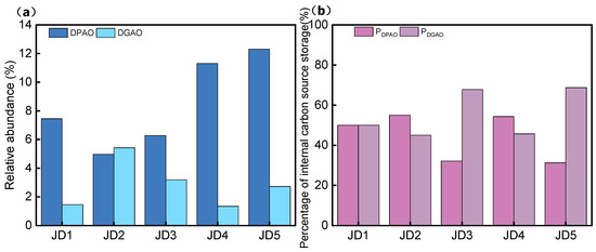 Proportions of DPAOs and DGAOs. (a). Relative abundance at each stage of DPAOs and DGAOs; (b) percentage of carbon source storage within DGAOs and DPAOs.
