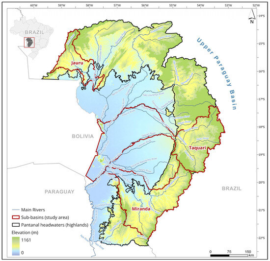 The spatial delineation of the three studied basins was obtained by GIS spatial analysis, with the basin outlets coinciding with the corresponding streamflow gauging stations, situated at the frontier between the basins’ highlands and the downstream Pantanal floodplain (Figure 3). The floodplain of each basin was that defined by the Brazilian National Water Agency (NWA).