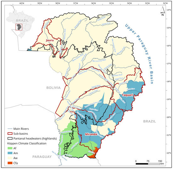 The three studied sub-basins span two different Köppen climate zones (Figure 2). The Cerrado Aw climate is marked by a summer rainy season and dry winters, with annual rainfall ranging from 1070 mm to 1720 mm in the Jauru basin and from 1472 mm to 2067 mm in the Taquari basin. The Miranda basin, with annual rainfall volumes ranging between 970 mm and 1480 mm, is located in the transition zone between the Köppen Aw, Af, and Am climates, the latter being characterized by summer monsoons and warmer temperatures [57].