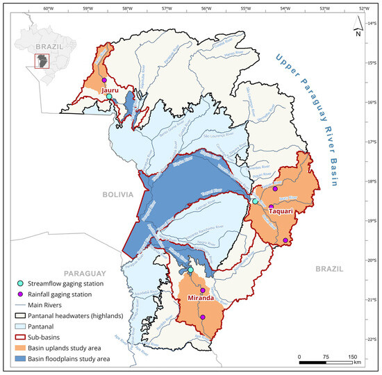 Upper Paraguay River Basin, with corresponding sub-basins, study areas, and rainfall and streamflow gauging stations.