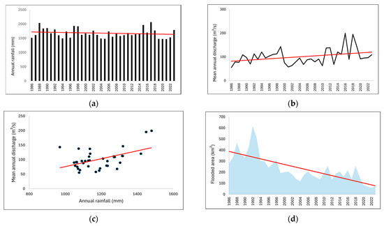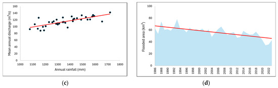 Figure 8c presents the correlation between P and Q (r = 0.5), and Figure 8d shows the time series of the Miranda downstream flooded area, with a significant decreasing trend (MK = −0.59, p < 0.001). The opposite trends observed in the series of streamflow and flooded area indicate that the latter was controlled by a different process from the former.