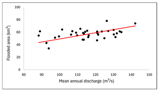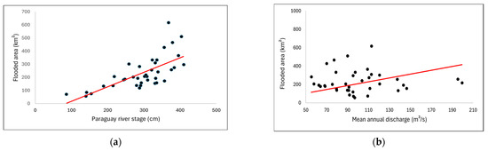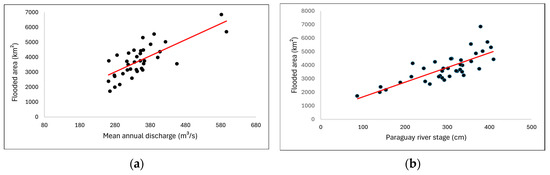 The positive correlation between TB annual streamflow and the basin’s annual flooded area (Figure 7a) was high (r = 0.72), indicating that the latter was influenced by the former. Additionally, Figure 7b indicates that the flooded area of the TB was affected by the backwater effect of the Paraguay river [71], given the significant positive correlation between them (r = 0.78).