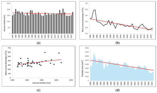 The time series of annual rainfall (a) and discharge (b) for the Taquari basin, their correlation (c), and the time series of the downstream flooded area (d) between 1986 and 2023.