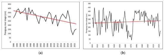 Similarly to the flooded areas, the time series (1983–2023) of the Paraguay river stage showed a significant decreasing trend (MK = −0.41, p < 0.001) (Figure 10a) and long-memory processes, given by a Hurst coefficient of 0.64. As opposed to the case in recent decades, the extended time series of the Ladario river gauge (1901–2023) showed an increasing but not statistically significant trend (Figure 10b) (MK of 0.06, p = 0.3), and an even higher Hurst coefficient (H = 0.69), indicating strong persistence.