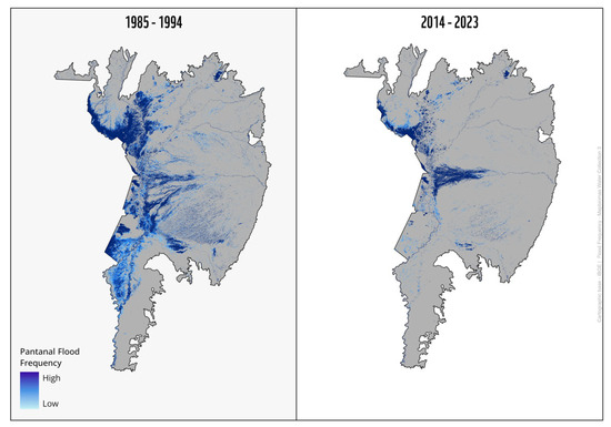 Despite the differences in the hydrology of the three studied basins, their flooded areas showed a systematically and significantly decreasing trend in the studied period (MK(JB) = −0.55, MK(TB) = −0.54, MK(MB) = −0.59, p < 0.001). This can be observed in Figure 11, indicating the relative flood frequency in the Pantanal floodplain in two recent 10-year periods, the latter being much drier than the former [39,40,78].