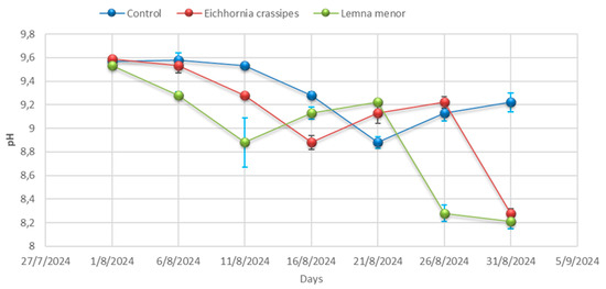 In the treatment containing E. crassipes, the pH varied from 9.59 ± 0.01 to 7.67 ± 0.04. The largest decrease recorded was 0.71 units between days 01 and 06 of the treatment, while the minimum decrease was 0.06 units between days 06 and 11, resulting in a total pH reduction of 1.92 units. Microbial degradation in the wastewater, which converts organic matter into acids [38], was the cause of the pH reduction in all treatments, with the L. minor treatment showing the highest microbial degradation. The L. minor treatment exhibited a pH reduction pattern similar to that of E. crassipes, with a variation from 9.53 ± 0.02 to 7.53 ± 0.06 during the evaluation period. The largest decrease in this treatment was 0.92 units between days 06 and 11, the smallest was 0.25 units between days 21 and 26, and the decrease was 0.24 units between days 26 and 31 of the analyzed period. However, between days 11 and 16, the pH increased by 0.13 units. Among all treatments, L. minor showed the greatest reduction in pH, followed by E. crassipes and the control treatment.