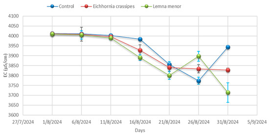 Among the three samples, L. minor showed the greatest decrease in EC, followed by E. crassipes and the control. The reduction in EC is due to nutrient absorption by the macrophytes, suggesting that L. minor has the highest nutrient absorption potential among the evaluated plants [40].