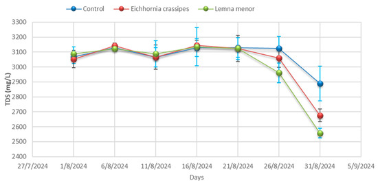 TDSs represent the amount of dissolved solutes in the wastewater, and plants absorb these dissolved salts through their roots as they grow, which decreases the concentration of TDSs over time [41]. The treatment with E. crassipes showed the highest efficiency in reducing TDSs, highlighting its potential for salt absorption in wastewater.