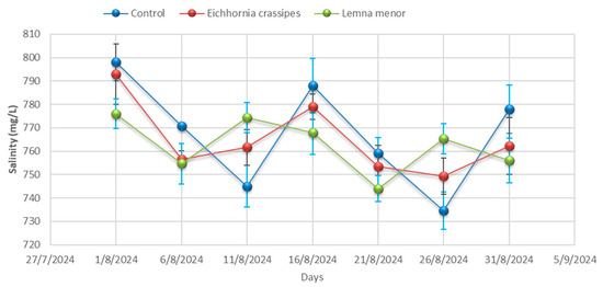 Salinity: Salinity refers to the total amount of dissolved salts present in wastewater. During the analysis period, salinity concentration decreased from 798.00 ± 7.94 to 755.00 ± 10.39 mg/L in the control, from 770.67 ± 12.86 to 337.00 ± 12.12 mg/L in the treatment with E. crassipes, and from 745.00 ± 6.25 to 395.33 ± 9.45 mg/L in the L. minor treatment (Figure 4 and Table A1).
