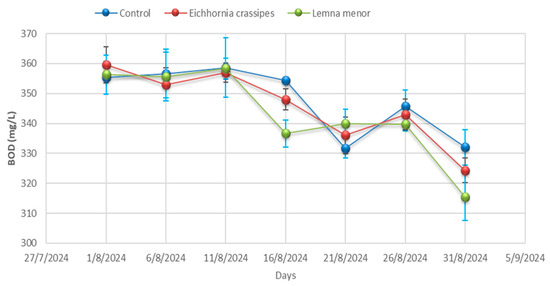 Biochemical Oxygen Demand (BOD): The values of biochemical oxygen demand (BOD) decreased during the treatment period in the evaluated systems, except for the control treatment, which increased by 6.67 mg/L between days 16 and 21. In the control sample, the BOD value decreased from 355.33 ± 5.51 to 308.33 ± 5.86 mg/L; in the E. crassipes treatment, it decreased from 356.67 ± 6.03 to 233.33 ± 4.16 mg/L; and in the L. minor treatment, it decreased from 358.67 ± 6.51 to 229.67 ± 7.77 mg/L (Figure 5 and Table A1). According to Deshmukh et al. [43], similar trends in the reduction in chemical oxygen demand (COD) were observed.