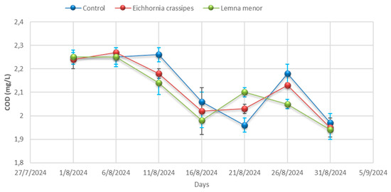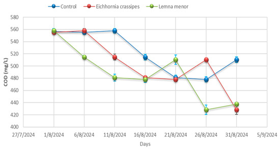 In the L. minor treatment, COD was reduced from 557.67 ± 3.21 to 174.33 ± 1.53 mg/L, representing the highest COD removal rate among the treatments, with a total reduction of 68.6%. COD removal fluctuations varied between 0.67 and 331.33 mg/L between consecutive periods, with the maximum value (331.33 mg/L) being reached in the first five days of treatment, while the minimum removal value (0.67 mg/L) was recorded between days 11 and 16 of treatment.