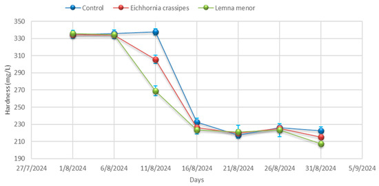 Hardness: The hardness in the wastewater also decreased across all treatments during the evaluation period. In the control sample, hardness was reduced from 334.67 ± 4.51 to 204.00 ± 4.58 mg/L; in E. crassipes, from 336.00 ± 4.36 to 178.00 ± 8.00 mg/L; and in L., from 337.67 ± 4.04 to 174.33 ± 1.53 mg/L (Figure 8 and Table A1). The total decrease in hardness was recorded at 39.04%, 47.02%, and 48.37% in the control, E. crassipes, and L. minor treatments, respectively, throughout the treatment period. The greatest reduction in hardness was observed in the L. minor sample, followed by E. crassipes and the control. The variation in hardness removal between consecutive evaluation periods ranged from 0.00 to 102.00 mg/L in the control, from −2.0 to 118.33 mg/L in E. crassipes, and from 0.67 to 111.33 mg/L in L. minor.