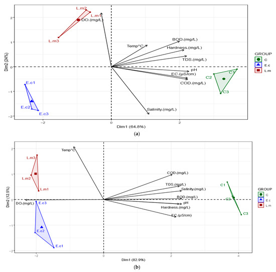 In the interpretation of the HJ-Biplot, the arrows represent the variables (e.g., BOD, COD, salinity), and the length of each arrow indicates the contribution of that variable to the total variance explained by the components. The direction and angle between arrows reflect the correlation among variables: arrows pointing in similar directions suggest a positive correlation, while those pointing in opposite directions suggest a negative correlation. The data points (samples or treatments) are represented by labels (e.g., C1, E.c1, L.m1), and their proximity to a particular arrow implies a stronger association with that variable. Clusters of points indicate similarities among treatment groups, facilitating the identification of patterns in the dataset [37].