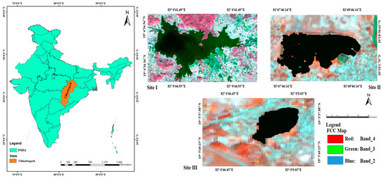 In this study, three water bodies, namely, the Dalpatsagar, Gangamunda, and Dudhawa Dams situated in the Bastar and Kanker districts and the larger water body of Chhattisgarh, were chosen to estimate GHG potentials. The location and base map of the study area is illustrated in Figure 1. Field campaigns were conducted in 2020 to collect water, sediment, and GHG samples. The mean average annual rainfall (1404 mm) in the study area and the recorded rainfall were 1121.5, 114.8, 45.3, and 124.8 mm with the average rainy days being 55, 7, 4, and 9, respectively [17], for the Dalpatsagar, Gangamunda, and Dudhawa Dams. The salient features of the study area are listed in Table 1.