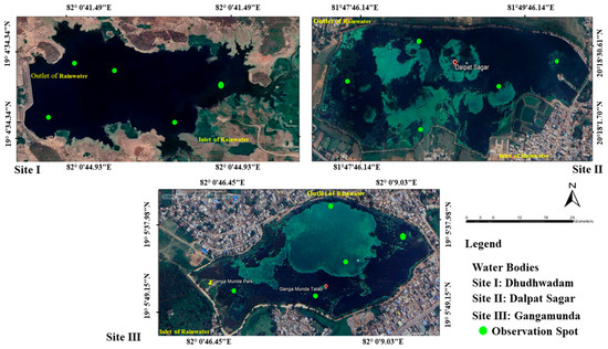Inlet and outlet georeferencing of selected water bodies: Site I.: Dudhawadam (water body), Site II.: Dalpatsagar, and Site III.: Gangamunda water body).