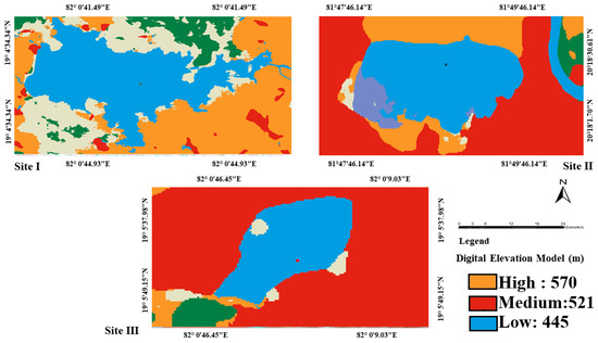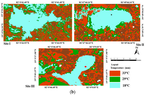 This study utilized specialized software customized to perform processing and analysis using ArcGIS 10.3. Spatial information, such as latitude, longitude, and altitude, were coordinated using handheld global positioning system (GPS) receivers. Portable GPS-based spot information was also collected. Google Earth images have been widely used to label the classes and validate the demarcation of water bodies (Figure 2 and Table 2). The spectral bands of the Landsat 8 Thematic Mapper sensor are also provided with descriptions. The Indian Meteorological Department (IMD) Viewer is the source of the annual rainfall and temperature for 2023 (Figure 3a,b). The current study used multispectral satellite data, Shuttle Radar Topographic Mission (SRTM), Digital Elevation Model (DEM), and topographical sheets (SOI) to create a database (Figure 4). The digitized map was modified and saved as an ArcView GIS software line coverage. Each water body had five spots for recording data on observation spots (Figure 2). The data were recorded at intervals of 7 days.