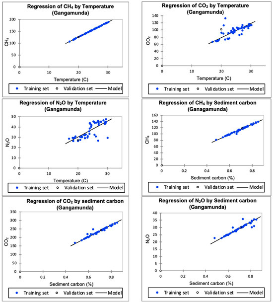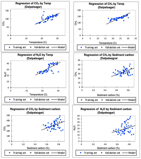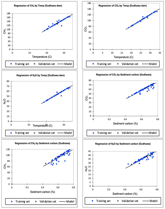 The precise model showed a conglomerated linear representation of temperature and sediment carbon with CH4, CO2, and N2O emissions. Regarding temperature, this factor governed the linear pattern. When the regression line was generated from the model development of the Dudhawa Dam, the model showed a linear increase in CH4, CO2, and N2O in response to the temperature of the water body studied. Methane showed little variation in the training set over the validation set of the model as compared with CO2 and N2O. In contrast, sediment carbon was assumed to be an independent factor which significantly influenced gas emissions. Among these gases, CH4 emissions were highly influenced by sediment carbon as compared with those of CO2 and N2O, an almost linear model with a training set (Figure 7).