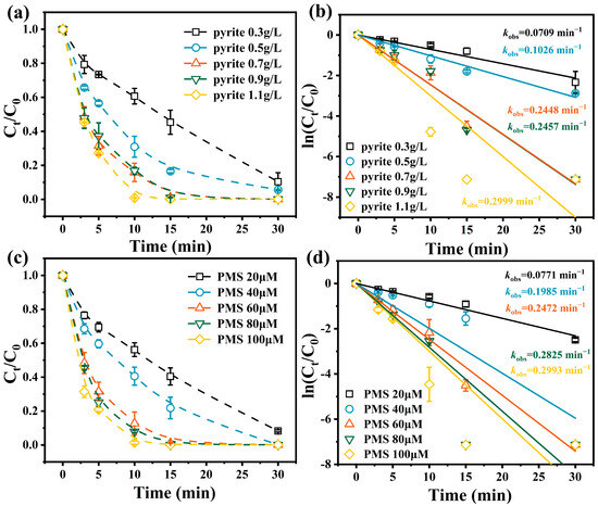 Effect of the amount of pyrite on the degradation of ACE (a) and pseudo-first-order kinetic plots (b). Effect of the concentration of PMS on the degradation of ACE (c) and pseudo-first-order kinetic plots (d). Conditions: [ACE]0 = 10 μM, [PMS]0 = 60 μM (for (a,b)), [pyrite]0 = 0.7 g/L (for (c,d)), initial pH = 7.0, T = 25 °C.
