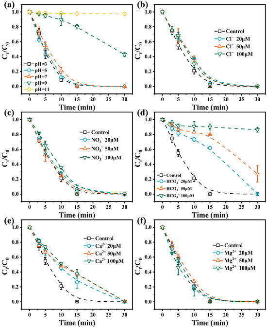 Effect of the initial solution pH on the degradation of ACE (a). Effect of Cl− (b), NO3− (c), HCO3− (d), Ca2+ (e), and Mg2+ (f) on the degradation of ACE. Conditions: [ACE]0 = 10 μM, [PMS]0 = 60 μM, [pyrite]0 = 0.7 g/L, initial pH = 7.0 for (b–f), T = 25 °C.
