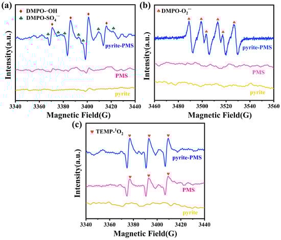 EPR spectra of DMPO- and DMPO- (a), DMPO- (b), and TEMP- (c). Conditions: [DMPO]0 = 100 mM for (a,b), [TEMP]0 = 100 mM for (c), [PMS]0 = 60 μM, [pyrite]0 = 0.7 g/L, vortexed for 10 min, initial pH = 7.0, T = 25 °C.