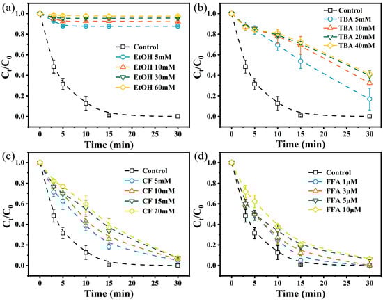 The contribution of different ROS to ACE degradation was evaluated through quenching experiments. EtOH was introduced into the system to quench SO4•− and •OH. Meanwhile, TBA was used to inactivate •OH, CF was employed to eliminate 1O2, and FFA was utilized to quench O2•− [42,43]. The subsequent experimental procedures were identical to those described in Section 2.3.1. The concentration of the quencher was progressively increased until the degree of inhibition of the reaction no longer changed significantly. The contribution ratio of the corresponding quenched ROS in the ACE degradation process was determined based on the maximum extent of reaction inhibition [44].