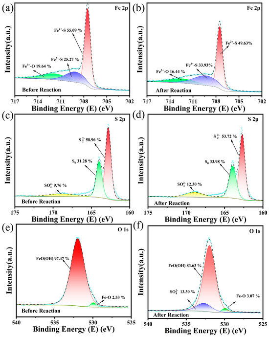 Figure 5a,b present the XPS spectra of the waste natural pyrite pre- and post-reaction. The Fe (2p3/2) spectra of the waste natural pyrite exhibit three diagnostic peaks at 707.5, 709.1, and 711.8 eV, matching Fe2+-S, Fe3+-S, and Fe3+-O [49,50]. No new peaks emerged, and no peak shifts were observed, indicating no significant changes in the pyrite structure post-reaction. Notably, the proportion of Fe2+-S decreased from 55.1% to 49.6%, while the proportion of Fe3+-S increased from 25.3% to 33.9% post-reaction.