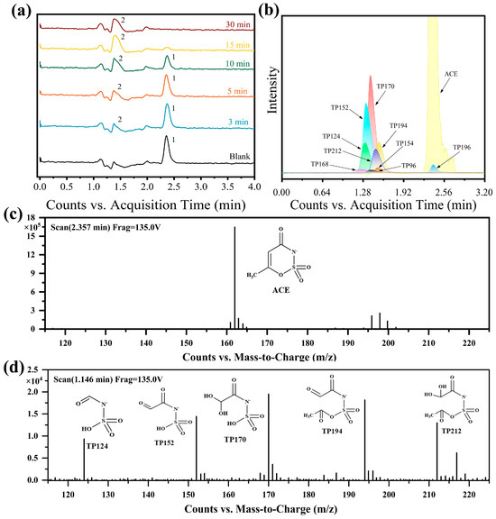 Figure 6a presents the chromatograms at various time points of the reaction, detected in full scan mode. The peak 1 corresponding to the substance identified at a retention time of 2.357 min was ACE (Figure 6c), which exhibited a decreasing trend over time and ultimately disappeared. In contrast, a peak 2 at a retention time of 1.416 min increased over time, which may be a degradation product of ACE. Analysis of the mass spectra associated with these product peaks identified five major TPs (Figure 6d). Additionally, four minor TPs were identified via SIM scanning based on the regularity of abundance changes over time (Figure 6b). The mass-to-charge ratios (m/z) of these TPs matched the values documented in the literature concerning ACE degradation products [53,54].