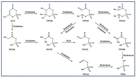 Their hypothesized structures and degradation pathways are depicted in Figure 7. Notably, the primary degradation pathway involves ACE oxidation to form TP196, which possesses a cyclic structure. This intermediate reacts with ROS, thus opening the ring to produce TP194. Through hydration and hydrolysis, TP194 is converted to TP170, which subsequently transforms into TP152 and TP124, ultimately forming TP96.