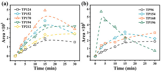 The peak emergence times of TPs (Figure 6b) and their abundance changes (Figure 8) in SIM scan mode further corroborated their structures and degradation pathways. The peak time of TP196 was comparable to that of ACE, indicating their similar polar structures and intact cyclic structure. Furthermore, analysis of the abundance changes of TP196 placed its highest abundance at the onset of the reaction, subsequently declining until it disappeared. Thus, TP196 represents the initial step of ACE degradation. TPs 124, 152, 154, and 170 exhibited similar peak times and a consistent trend in abundance, i.e., an increase followed by a decrease, indicating their structural similarities and functions as intermediate products in the reaction. Conversely, the abundance of TPs 212 and 96 continuously increased until stabilization, suggesting they are the final ACE degradation products.