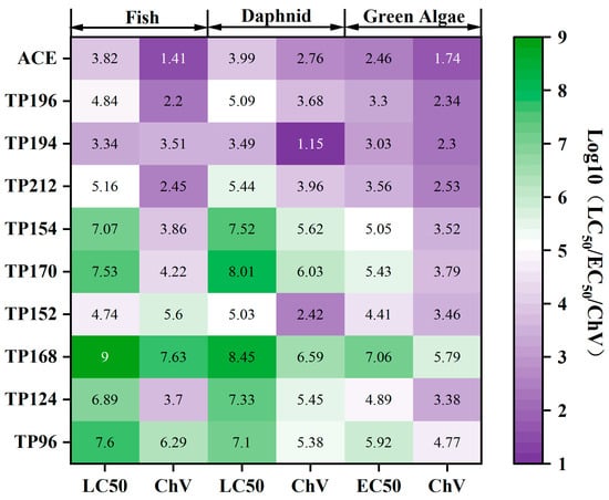 The ecological structure–activity relationship model (ECOSAR) developed by the US EPA was used to assess the ecotoxicity of ACE and TPs [45]. The acute toxicity of the pollutants to fish and Daphnia was evaluated using LC50 (mg/L), the acute toxicity of the pollutants to green algae was evaluated using EC50 (mg/L), and the chronic toxicity of the pollutants to fish, daphnia, and green algae was evaluated using CHV (mg/L).