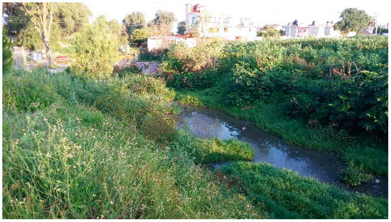 The Sector Popular natural wetland (Figure 1) is located along a section of the San Bernardino River channel in the municipality of Texcoco, State of Mexico, at coordinates 19°28′41″ N, 98°52′43″ W, and an elevation of 2269 m.a.s.l. The wetland receives direct wastewater discharges throughout the year from the Sector Popular and San Luis Huexotla neighborhoods. During the dry season, the river carries only wastewater [29], whereas in the rainy season (May through September) [30], it also receives surface runoff originating upstream of the catchment area of the micro-watershed named after the river.