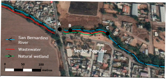 The Sector Popular wetland runs parallel to the river channel, but the flow directions are opposite (Figure 2). Three key reference points are identified at the site: a road bridge (Point A), the point of wastewater discharge (Point B), and the downstream end of the wetland (Point C). The section between Points A and B—which spans approximately 30 m—represents the inflow (Influent), while Point C marks the outflow (Effluent) of the wetland. This segment was selected as the influent zone due to the site’s topography and the limited access to the discharge outlet, which made it impossible to collect samples directly at that point. Additionally, this area exhibited the highest concentration of contaminants during field observations and showed consistent physical characteristics in the wastewater. The flow within the wetland moves in the opposite direction to that of the river due to the backwater effect generated upstream by the road bridge.