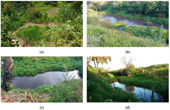 Figure 3. Photographs of four zones of the Sector Popular natural wetland (August 2018): (a) the degradation zone, (b) the active decomposition zone, (c) the recovery zone, and (d) the clear water zone. - Active decomposition zone—Extending from the discharge point to approximately one-third of the remaining distance to the wetland’s outlet (Figure 3b). This section exhibits severe contamination, characterized by the absence of dissolved oxygen and intense anaerobic decomposition. As a result, gas bubbles emerge, forming black foam on the surface. The water appears gray to black and emits a strong fetid odor.