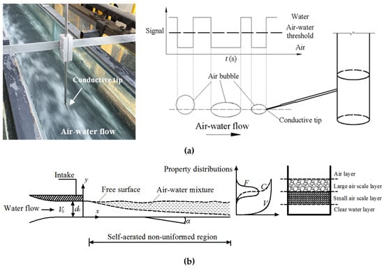 In high-speed water flows, air–water transfer is derived from free surface aeration, e.g., running streams, rivers, and spillways. The self-aerated flow is characterized by strong turbulent mixing and a substantial amount of air entrainment, and the flow structure is complex, including individual water drops and bubbles with irregular shapes, air–water projections, and foam [1,2,3]. Uniform self-aerated flows were analyzed to obtain a homogeneous and equilibrium assumption to establish a basic model, while for non-uniform self-aerated flows, two microscopic concepts of “entrained air” and “entrapped air” have been proposed, which indicate that the air–water in a non-uniform self-aerated flow may not be seen as a homogeneous mixture. The two air types have different effects on air–water properties, including bulk interest, cavitation prevention, and gas transfer [4,5,6]. Furthermore, for environmental fluid issues, the assessment of the water quality of rivers and streams is strongly affected by the air–water transfer frequency across the two-phase interface. Thus, the microscopic properties of air–water structures and the development process are an important interest for the study of mixed flows.
