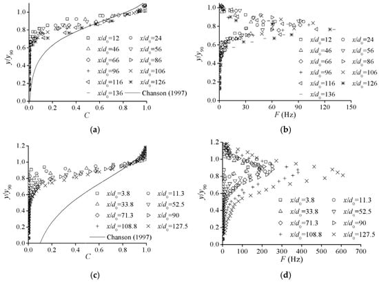 Profiles of air concentration and bubble frequency along the flow development: (a) C(y/y90), α = 13.5°, Re0 = 2.0 × 105; (b) F(y/y90), α = 13.5°, Re0 = 2.0 × 105; (c) C(y/y90), α = 28°, Re0 = 3.4 × 105; (d) F(y/y90), α = 28°, Re0 = 3.4 × 105 [16].