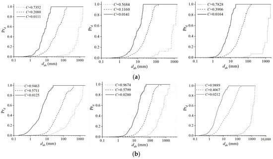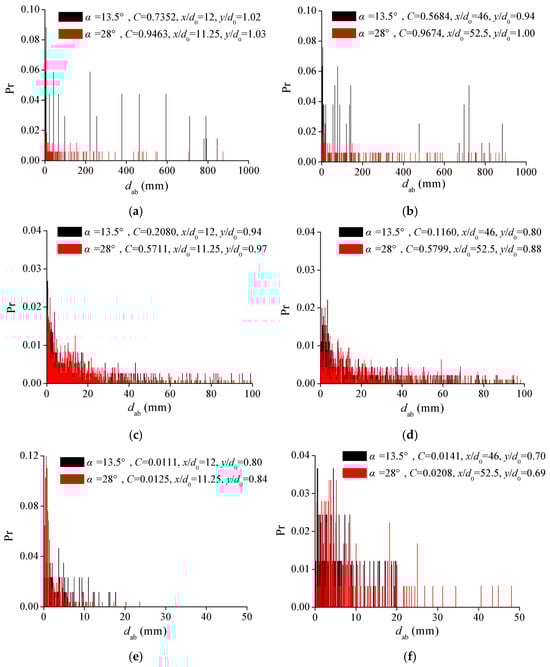 Figure 3 shows air chord size distributions at various positions in the self-aerated region. Note that for high-air-concentration regions (C > 0.50), the range of air chord length extends over several orders of magnitude, with the greatest chord length even reaching 102~103 mm. This is mainly because of the large-scale roughness and wavy appearance and the fact that the air transported with the water flow is “entrapped air” instead of individual air bubbles entrained into the flow. In Figure 3, when the chute slope α and flow turbulent intensity Re0 are greater, the distribution of air chord length is more continuous from small to large scale in the high-air-concentration region (in Figure 3a,b), and the proportion of small-sized bubbles is greater in the low-air-concentration region (in Figure 3e,f). As the air concentration decreases, the range of chord length decreases and the distributions are skewed with a preponderance of small bubble sizes. For the lowest air concentration (C < 0.02~0.03), the bubble sizes are mainly smaller than 20 mm, indicating that the air transported with flow in this area is mainly in individual entrained bubbles.