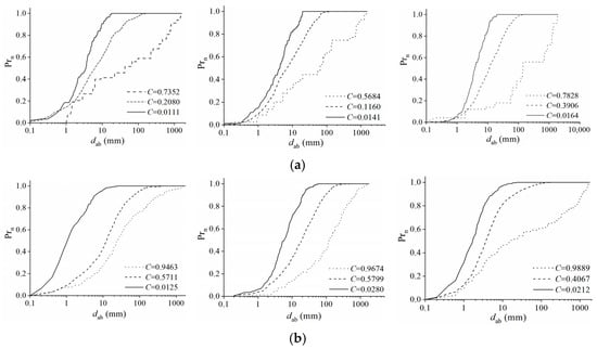 Figure 4 and Figure 5 show the air amount (Prn) and chord size (Prd) cumulations at various positions in the self-aerated region. For the air amount cumulation, the rising tendency declines with the chord length increase. It is suggested that the probability of bubble chord length is the largest for small bubbles between 0–20 mm, and the preponderance of small bubble sizes increases as the air concentration and the distance from the free surface decrease. For the air chord size cumulation, the rising tendency is slow in the small chord length range when the air concentration is high (C > 0.50), and it increases sharply at the large chord length range. When the air concentration decreases, the rising tendency differs to a similar shape of bubble amount cumulation, and the size cumulation falls behind the amount cumulation throughout. This indicates that within the self-aerated zone, small-sized air dominate quantitatively while large-sized air have a large portion in terms of air content. This is because the large-scale surface roughness contains more entrapped air, which makes a greater contribution to air content compared with the individual entrained air bubbles. This specific difference remains in the self-aeration development downstream.